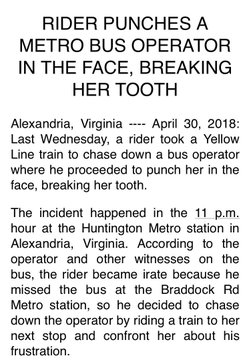 Man accused of punching female @wmata bus driver in the face, breaking her tooth after he missed the bus. Union says guy rode train to catch up w/ driver at Huntington Metro station. He’s still on the loose. Union provided surveillance photo. @fox5dc pic.twitter.com/kcDTlTCHRT— Lindsay Watts (@LindsayAWatts) 30 de abril de 2018